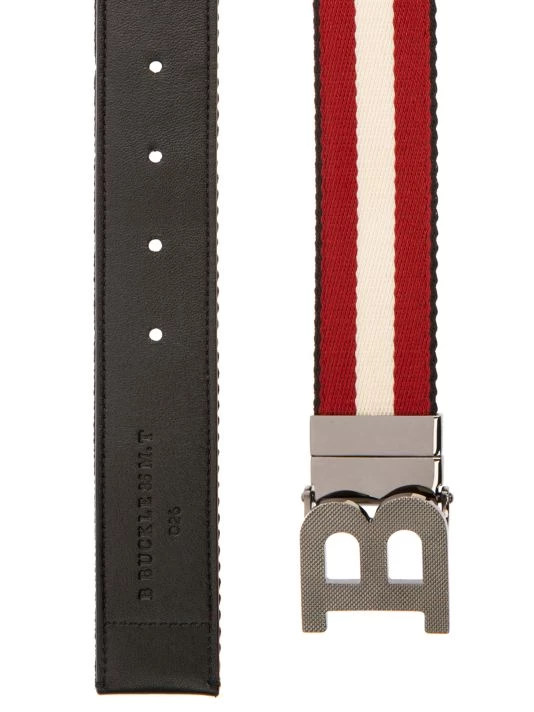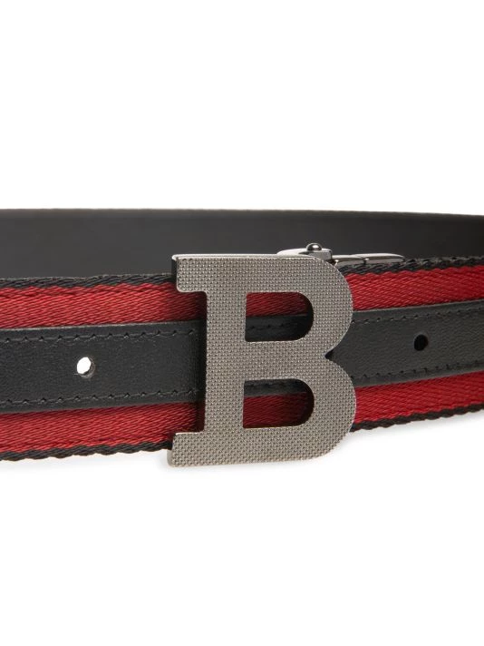 From the B Buckle Collection. Iconic buckle secures an Italian-made belt that reverses from sleek leather to striped textile.