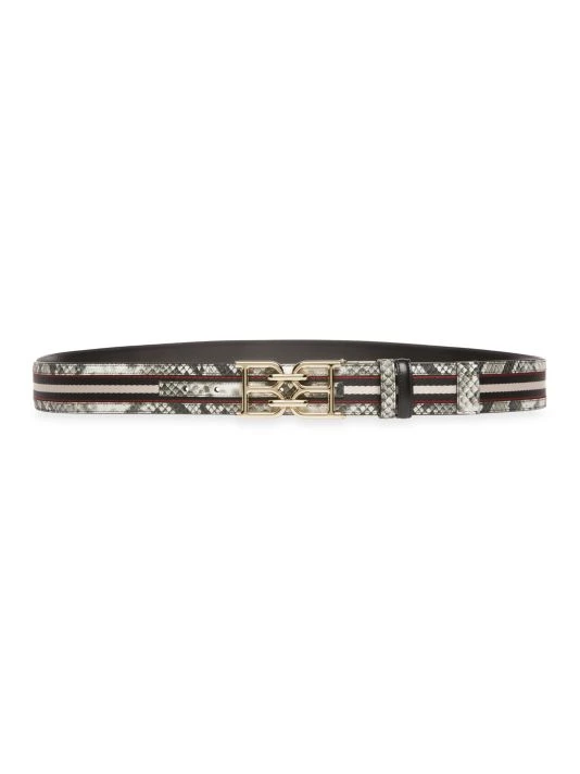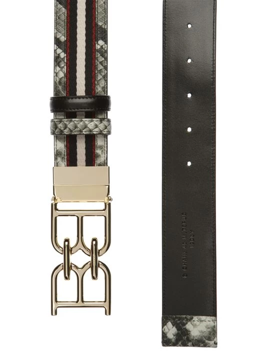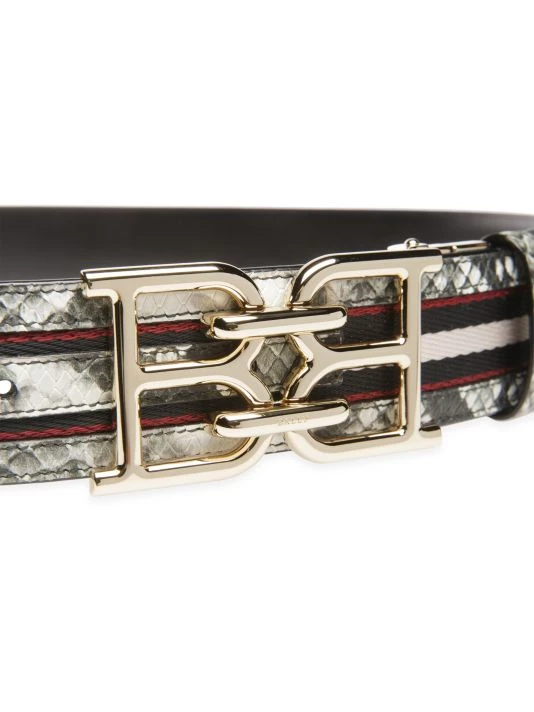 This belt is adorned with a snakeskin-embossed print, goldtone Bally buckle, and striped details.