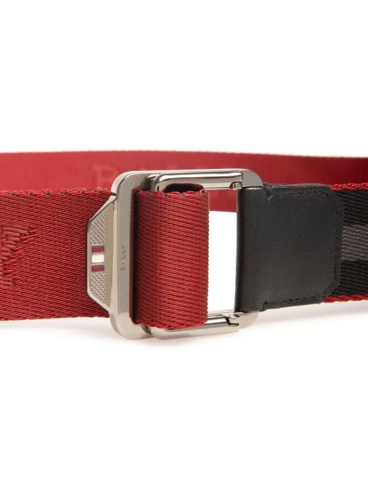 A stitched logo and tonal stripe pattern accent this stylish belt.