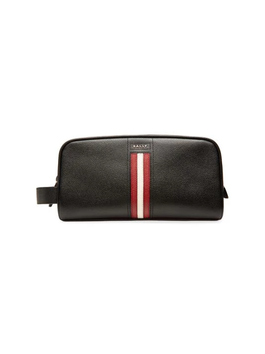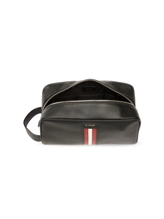 Bally crafts this sleek travel case with elegant pebbled leather. The signature two-toned stripe and metal logo plaque complete the look.